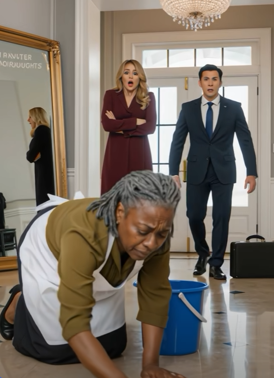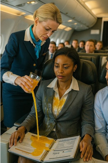 Flygvärdinnan, som kände igen den svarta kvinnan, hällde juicen från glaset över henne, och